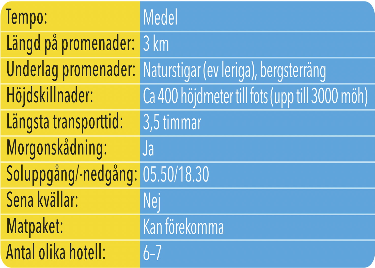 • flygplatstransfer ifall du väljer att komma på annan tid än samlingstid (kan dock ingå om flygförbindelser omöjliggör att gruppen anländer samtidigt)