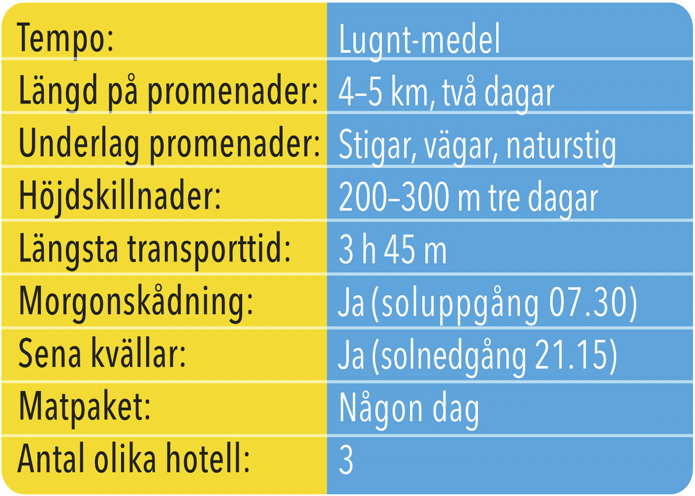 Då detta är en skåda med kamera-resa kommer vi att lägga gott om tid på varje lokal och inte stressa. Transporterna under resan kommer mestadels vara relativt korta, cirka 40 min som längst de flesta dagar. Längsta transporterna blir första och sista dagen, 3 h respektive 3 h 45 min. Ett par lite längre promenader ingår, cirka 4–5 km, dock i lungt tempo där vi skådar och fotograferar under tiden. Terrängen är mestadels vägar och stigar men även naturstig och någon längre stentrappa förekommer. Vid ett par tillfällen kommer dessa promenader innebära en höjdskillnad på 200–300 meter. För att ta vara på de timmar på dagen då fågelaktiviteten är som högst och ljuset är som bäst för fotografering kommer vi att skåda såväl morgon som kväll de flesta dagar. Vi kommer dock att ha längre lunchuppehåll med tid för 2–3 h siesta på hotellet de flesta dagar.