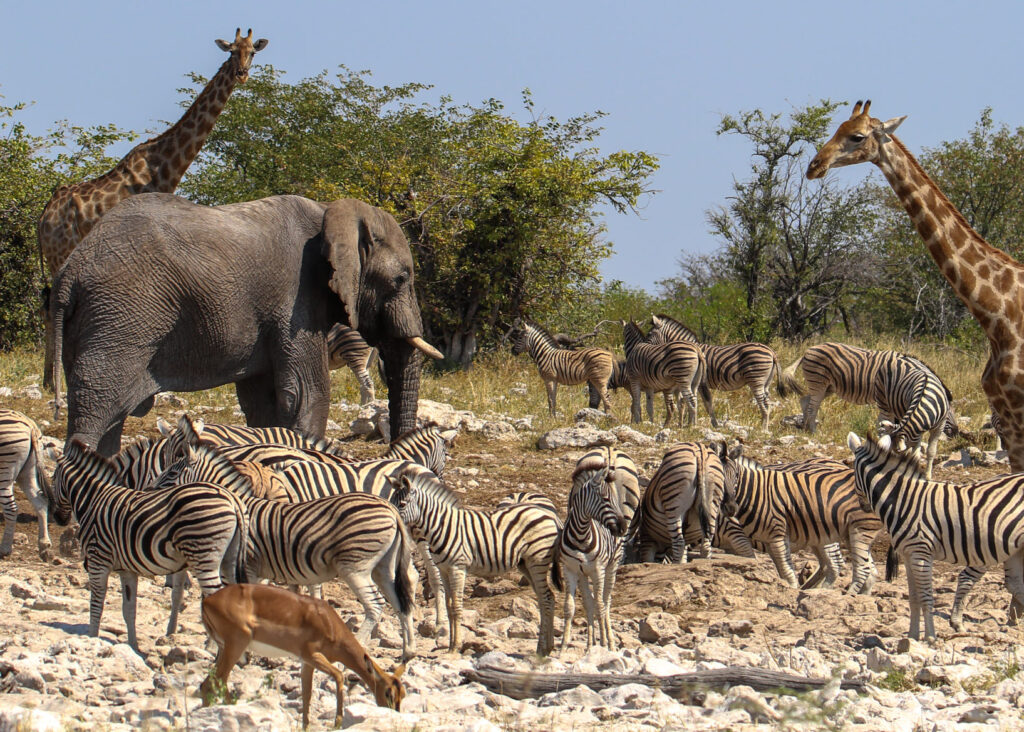 I Etosha nationalpark upplever vi savannens klassiska Afrikakänsla. Här kombineras imponerande fåglar som koritrapp, näshornsfåglar och många rovfåglar med möten vid vattenhålen med elefanter, giraffer, zebror, noshörningar och rovdjur som lejon och hyenor.
