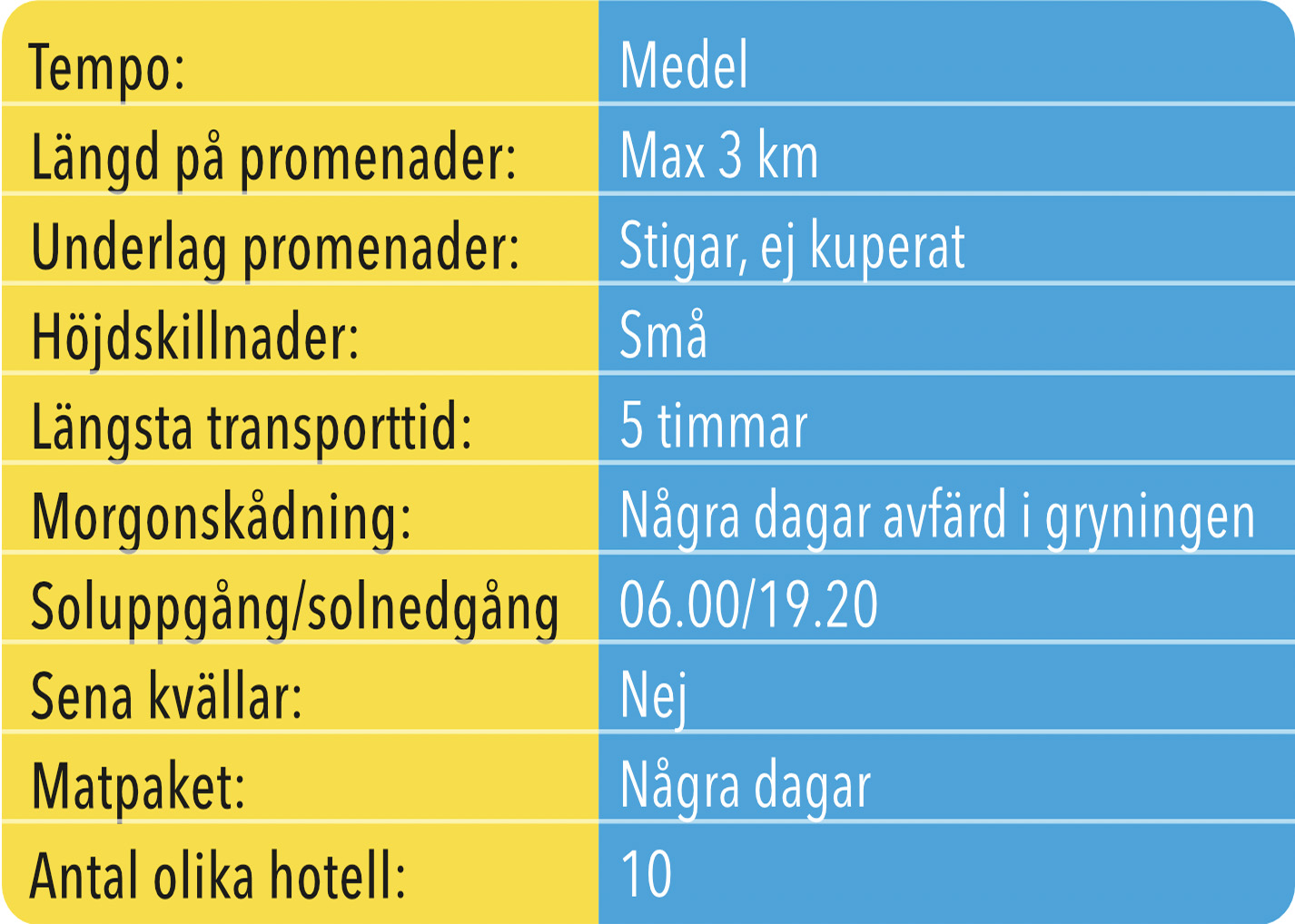 Resan i Namibia innebär relativt långa transporter med bil, eftersom landet är stort och avstånden mellan de olika naturmiljöerna är betydande. Den längsta kördagen är mellan Etosha och Rundu då vi färdas ca 5 timmar. Övriga transportdagar ligger oftast på 3–4 timmar, och körningarna sker i lugnt tempo med regelbundna stopp för bensträckare, naturupplevelser och fotografering. Promenaderna under resan är oftast mellan 1 och 3 kilometer. Vandringarna sker utan tekniskt svår terräng, men kan ibland gå på stenig och ojämn mark. Höjdmässigt rör vi oss huvudsakligen mellan 1 000 och 1 700 meter över havet, med Windhoek som högst belägna plats. Dessa höjder påverkar normalt inte orken, men kan innebära något svalare nätter i inlandet. Kustområdena ligger nära havsnivå. Resan innebär några tidiga morgnar, särskilt under safari i Etosha och vid Okavangofloden, då djurlivet är som mest aktivt. Väckning kan då ske runt 05.00–06.00. Kvällarna blir inte sena, men i Etosha stannar vi vid något tillfälle ute vid ett vattenhål till efter mörkrets inbrott.