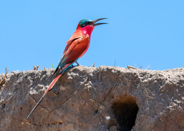Resans kanske starkaste fågelupplevelse är Walvis Bay-lagunen med alla vadare samt goda chanser att se den endemiska damaratärnan. I Damaraland väntar ökenendemer som Dune Lark och Etosha bjuder på klassiska savannfåglar vid vattenhålen, där Kori Bustard, Bare-cheeked Babbler, Violet Woodhoopoe, Blue Crane och flera rovfåglar hör till höjdpunkterna. Vid Okavangofloden skiftar fågellivet helt, med African Fish Eagle, kungsfiskare, Goliath Heron och chans på den mytomspunna Pel’s Fishing Owl. Redan runt Windhoek får vi kanske möta specialarter som Rockrunner och Bradfield’s Swift, medan Waterbergplatån avslutar resan med ett rikt rovfågelliv.