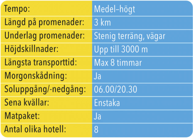 Då vi är på höga höjder kan det vara kyligt och blåsigt, kanske till och med snöfall. Räkna med temperaturer på allt ifrån 0 till 25.